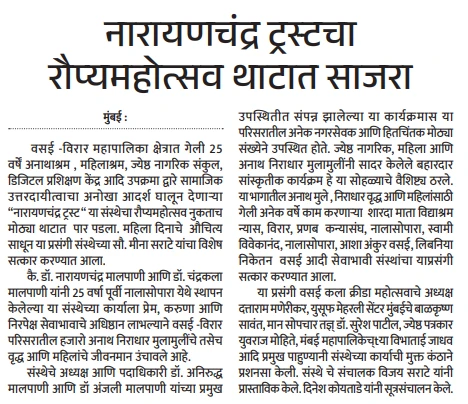 Late. Dr. N. K. Malpani & Dr. (Mrs.) C.N. Malpani wanted to help poor children and orphans. They established the Narayanchandra Trust in 2001. This is a registered Charitable Trust under the Charitable Public Trust Act. 1950 and Income Tax Exemption Under 80-G. Trust hopes to help 50 orphans Children to stand on their own feet and become productive citizens by providing them opportunities for growth and development. For other poor children, the trust provides help in the form of scholarships and sponsored educational programs.